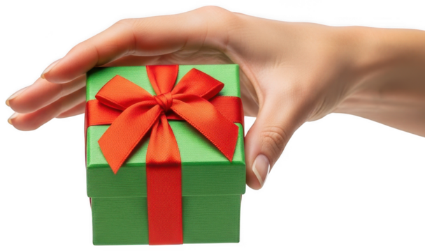 A hand dressed as santa claus holding a green gift box with a red bow isolated on transparent background