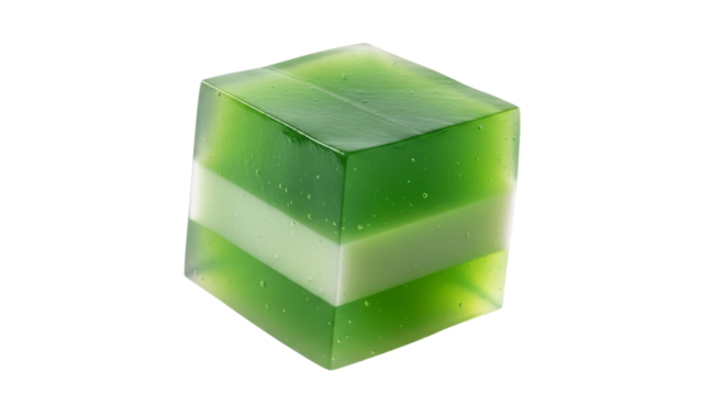Minty delight: translucent cube of green and white layered gelatin on a white expanse offering freshness, purity and geometric appeal