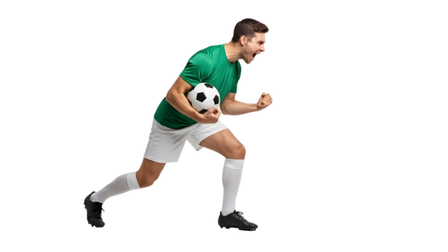 photograph of a soccer player wearing a green t-shirt, white shorts, and black shoes, kicking a ball, isolated against a solid transparent background