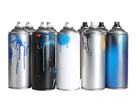 Multiple aerosol paint cans, some with colorful drips, are arranged for artistic projects.