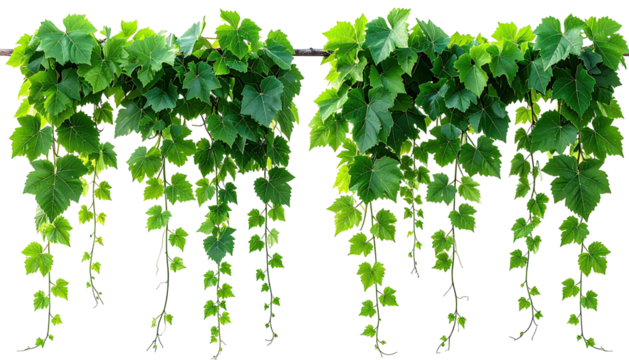 A bunch of green grape trees with leaves and green grapes are hanging on a transparent background