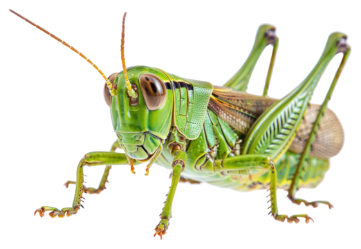 Detailed close-up of a vibrant green grasshopper on a white background showcasing its intricate anatomy and texture