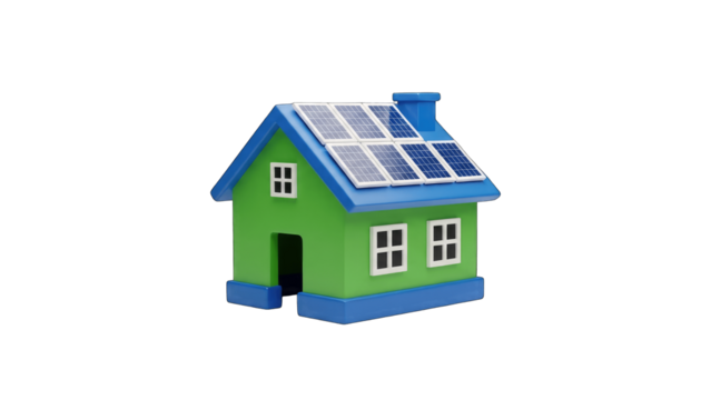 3d house illustration with solar panels on transparent background