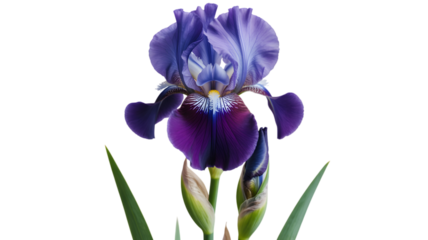 Isolated purple iris flower, a beautiful spring bloom on a vibrant green stem. Close-up shot