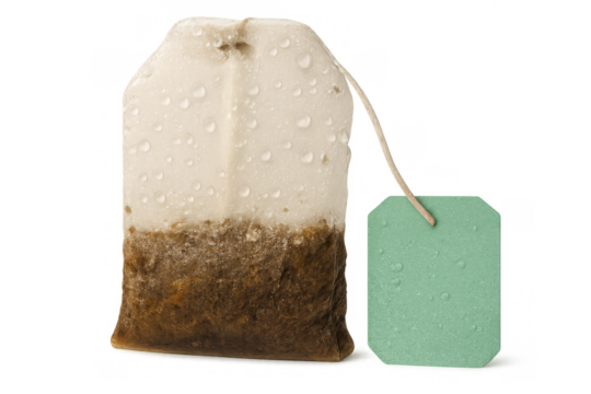 Used wet tea bag with water drops and unbranded green label on a transparent background, brewing hot beverages