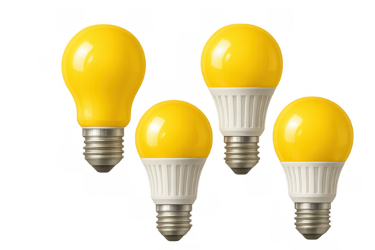 Yellow led light bulbs glowing, representing energy saving, innovation, and bright new ideas on a transparent background
