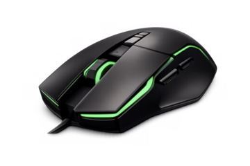 Gaming mouse with green led lighting, ergonomic design for esports and computer peripherals on transparent background