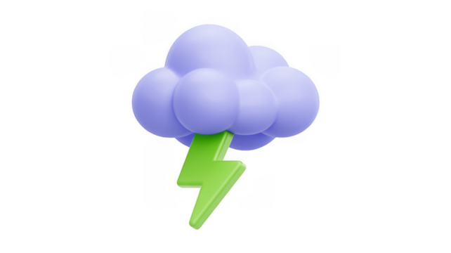 Green lightning bolt under cluster of purple clouds isolated on a transparent background
