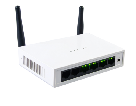 Angled Shot of White Wireless Router with Antennas and Illuminated Green Lights, Isolated