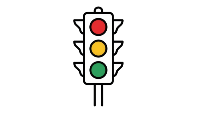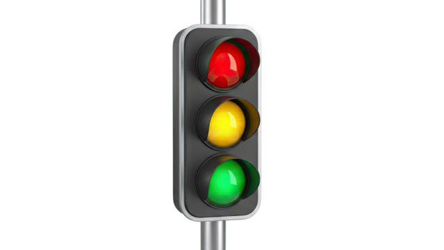 Traffic light with red, yellow, and green lights isolated on transparent background