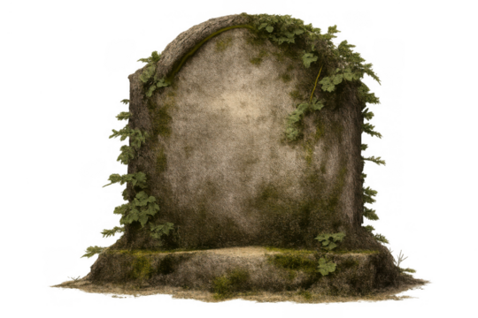Old, weather-beaten tombstone covered in green ivy and moss, standing as a memorial marker on transparent background
