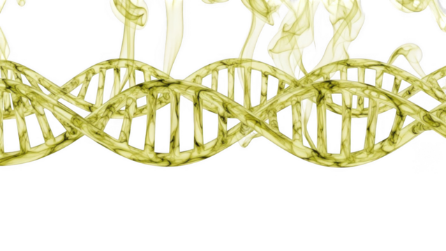 Yellow D N A helix structure with smoky wisps against background isolated on a transparent background
