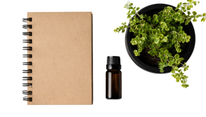 Open green spiral bound notebook with pencil isolated on transparent background