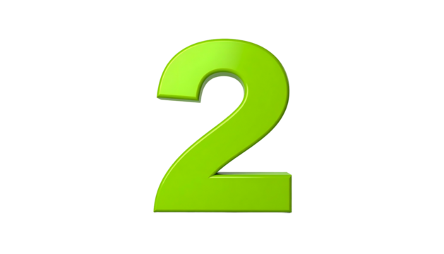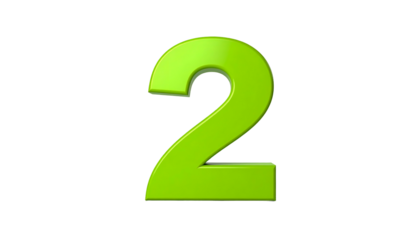A vibrant, glossy, green number two against a stark black background. The numeral is 3D rendered with highlights