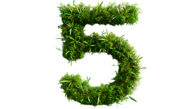 Digit 5 made with grass, PNG file, transparent background, isolated on white