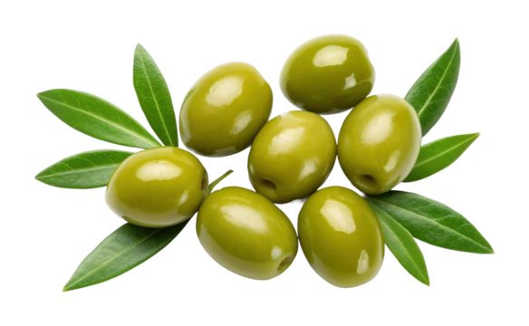 Marinated green olives with pimento stuffed centerpiece displayed isolated on a transparent background showcasing smooth shiny texture and unique shapes