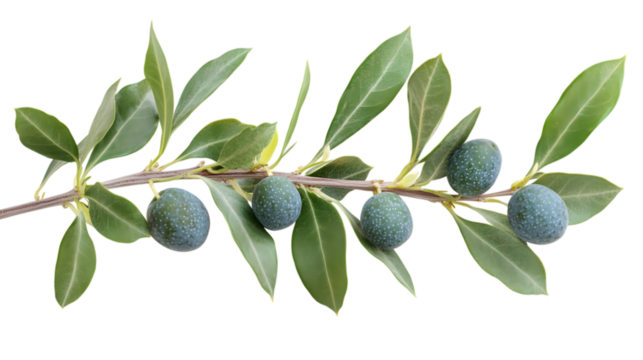 Green Olives: Fresh, vibrant, green olives glistening, artfully arranged on a twig with leaves, evoking the essence of the Mediterranean.