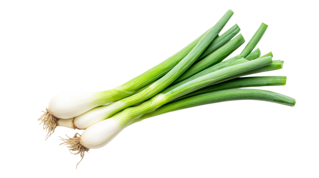 Fresh green onions with white bulbs, isolated on white transparent background, concept of healthy eating.