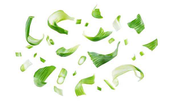 Fresh Green Onions Chopped in Mid-Air, Falling Scallions, Dynamic Food Photography, Sliced Spring Onion Pieces, Organic Cooking Ingredient, Healthy Vegetable, Isolated on Transparent Background