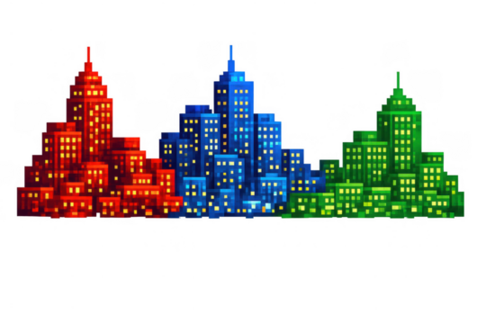 Colorful pixel art city skyline showing vibrant red, blue, and green urban buildings with many illuminated windows, transparent background