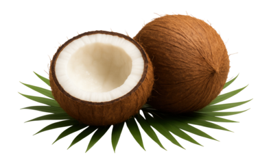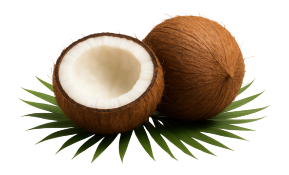 Split coconut with white flesh and whole brown coconut on green palm leaves.