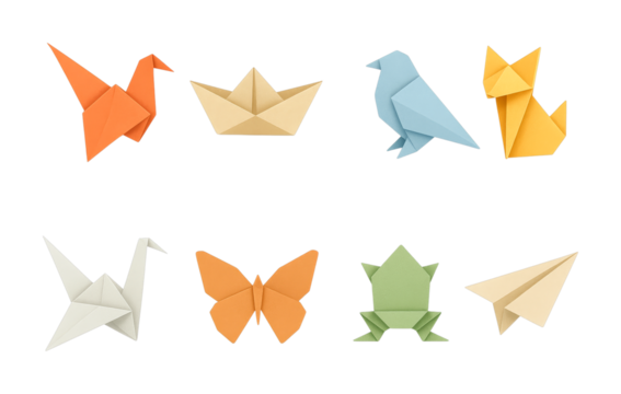 Eight colorful origami figures crafted from folded paper, including birds, a boat, a fox, a butterfly, a frog, and a paper airplane.
