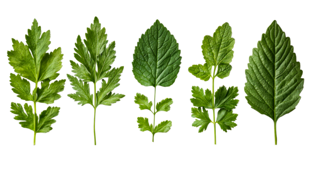 A lush green wall composed of various plants and foliage, isolated on a transparent background