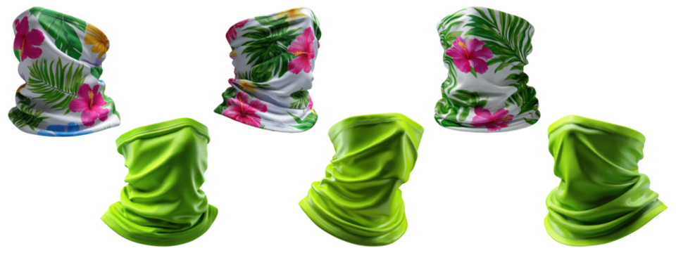Collection of six colorful neck gaiters with tropical floral and solid green patterns
