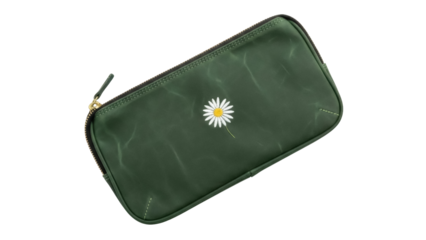 Isolated green waxed canvas pencil case featuring embroidered daisy flower pattern design