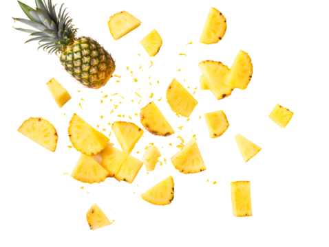 Falling Pineapple slices isolated on Transparent background, full depth of field, lipping path,pineapple in full depth of field, Falling candied fruit, Cut pineapple on transparent background, ring,Ai