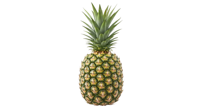 A whole pineapple with its rough textured skin and green crown, showcasing the fruit’s bright tropical color and fresh