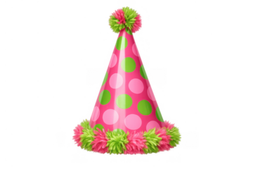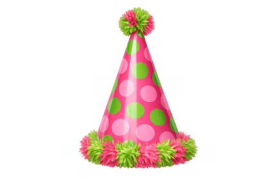 Colorful polka dot party hat with pompom and fringe isolated PNG, fun celebration headwear for birthday or festive event on transparent background