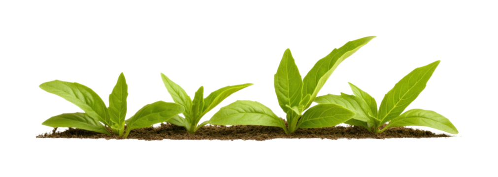 Growing fresh green plants in healthy soil environment isolated on transparent background