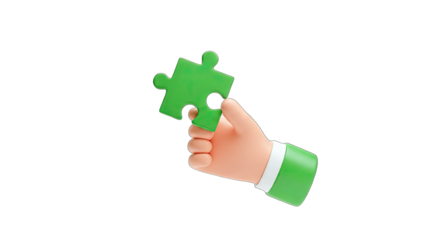 Hand holding green puzzle piece on transparent background