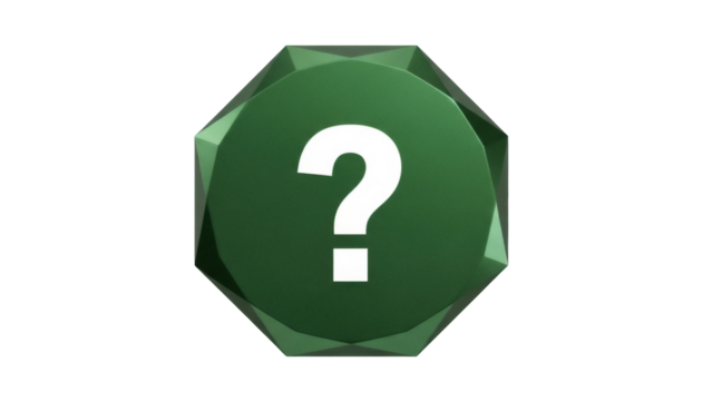 Green question mark gem PNG isolated on transparent background, mystery concept for games and education, unknown symbol