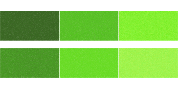 A visual display of six rectangular blocks showcasing various shades of green colors arranged in two rows.