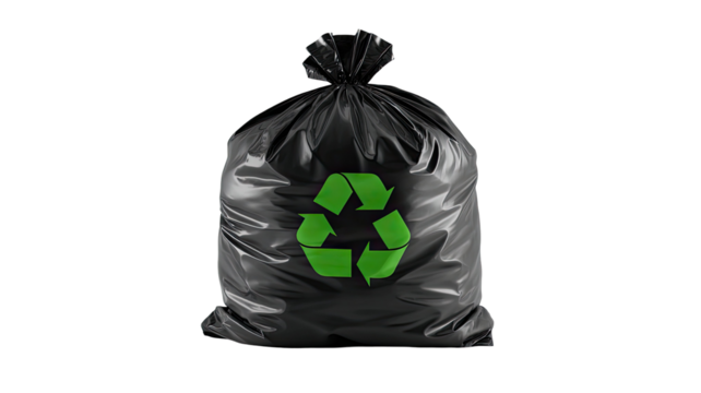 Black garbage bag with green recycle symbol representing waste management eco friendly disposal and environmental awareness isolated on white background
