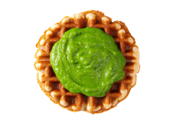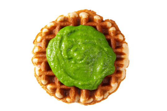 a waffle with a green sauce on top