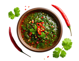 A bowl of fresh green pesto sauce garnished with basil leaves, isolated on a transparent background