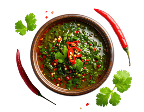 Fresh green sauce in a wooden bowl garnished with cilantro leaves, isolated on a white background.
