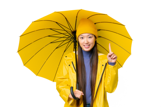 Young Asian woman with rainproof coat and umbrella over isolated chroma key background showing and lifting a finger in sign of the best