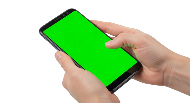 Hand holding smartphone with green screen isolated on transparent background