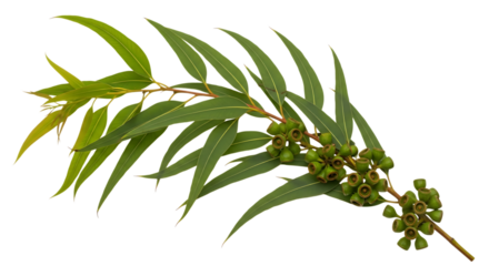 Eucalyptus branch with green seed pods and long slender leaves isolated on a transparent background image
