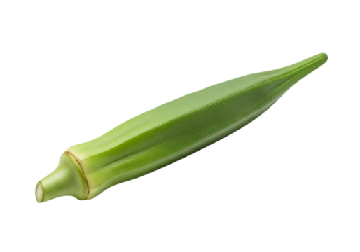 A single fresh green okra pod, a vegetable known for its edible green seed pods, isolated on transparent background