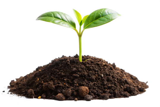 A small green seedling growing from a mound of rich dark soil isolated on transparent background