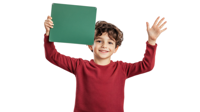 A cheerful individual with glasses and a red top holding a green sign against a black backgrou