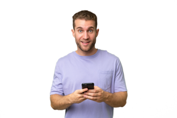 Happy young man with curly hair, smartphone in hand, light green shirt, transparent background