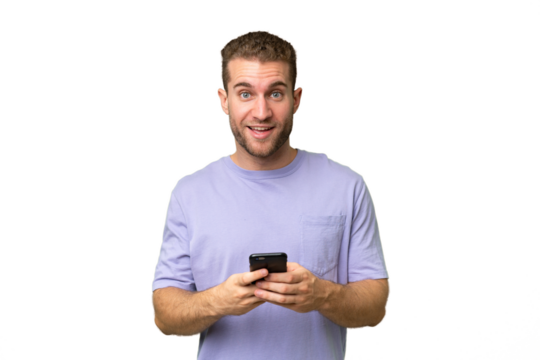 Young handsome caucasian man isolated on green chroma background surprised and sending a message
