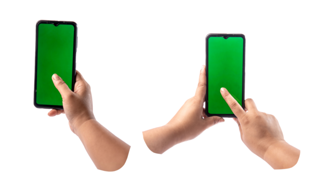 Smartphone mockup on transparent background. Hand holding mobile phone with blank, transparent and green screen. for advertising online.