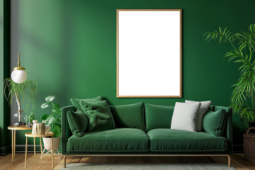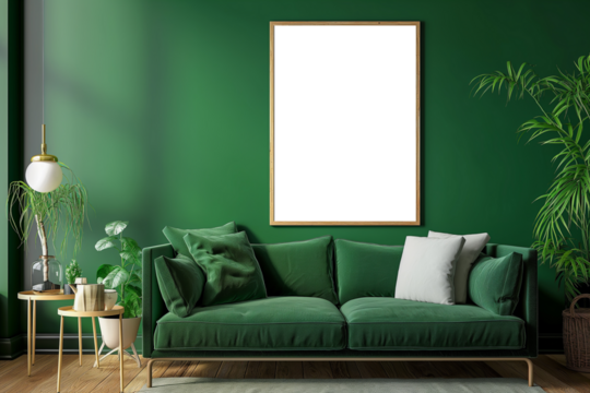 Green living room interior and green sofa with poster mockup. 3d rendering